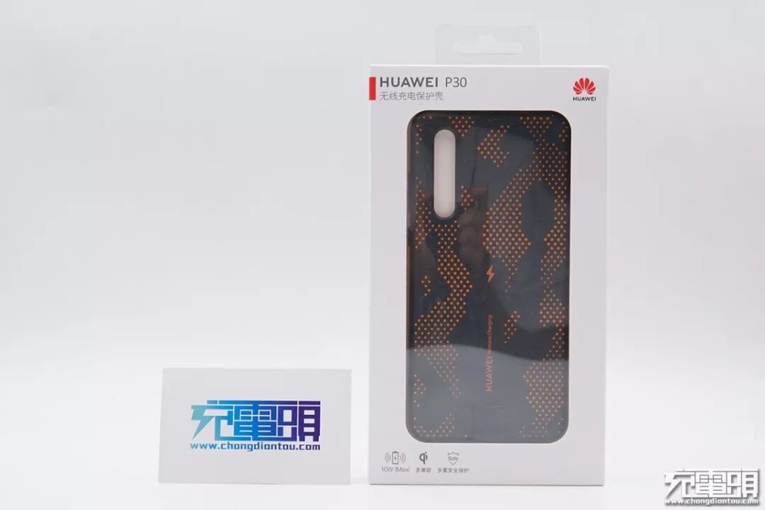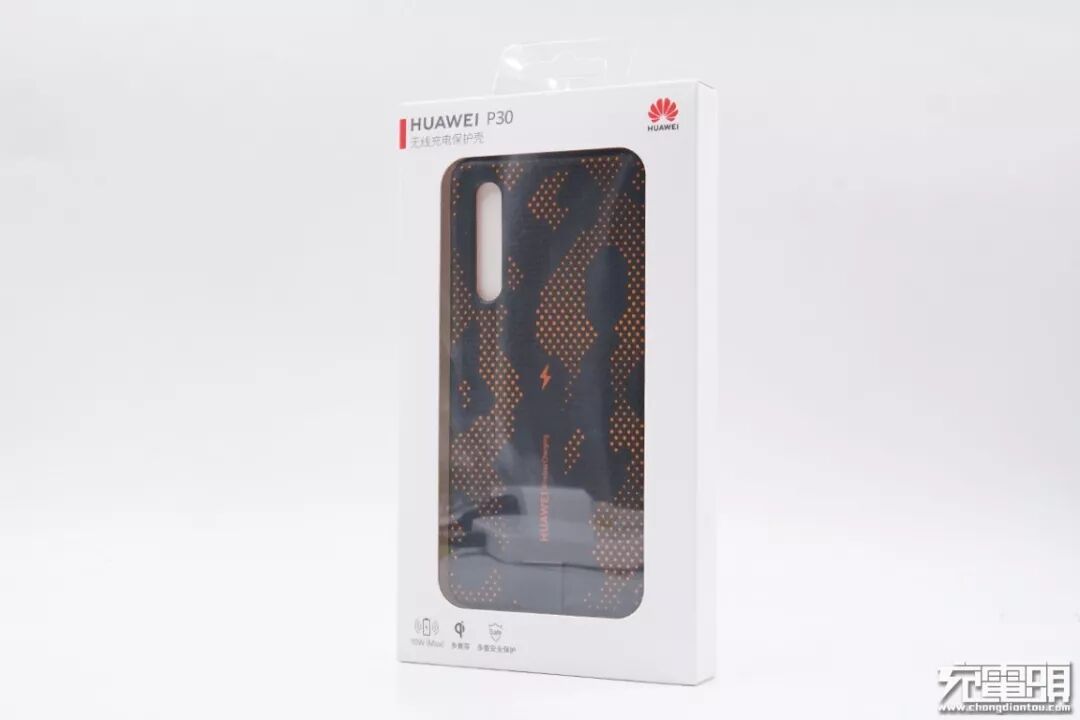 产品包装采用透明开窗设计,可以直接看到产品实物图。包装左上角为产品名称:HUAWEI P30无线充电保护壳。产品提供动感橙、电光蓝两个配色,我们选购的是动感橙版本。