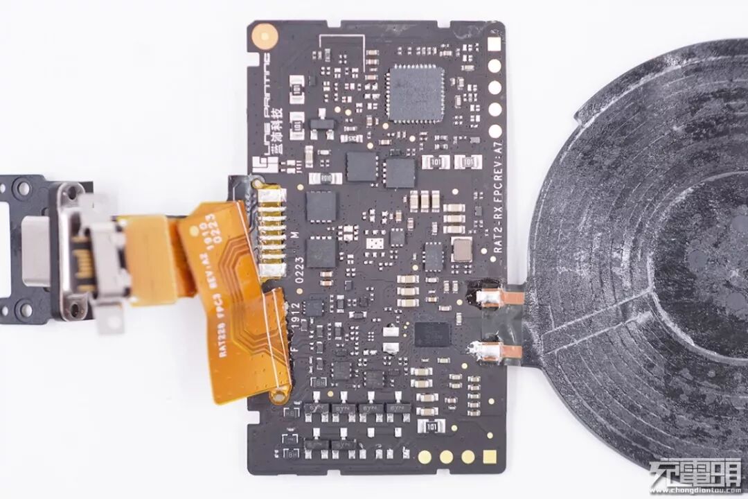 无线充电接收线圈通过排线连接到下面的接收板上。