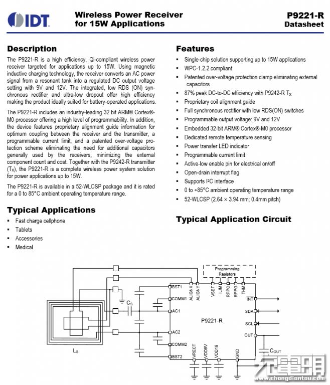 IDT P9221 无线充电接收器芯片,单芯片解决方案,最高支持15W输出,兼容WPC 1.2.2标准,内置低阻抗同步整流器,内置微处理器,支持I2C接口,采用52pin WLCSP封装。