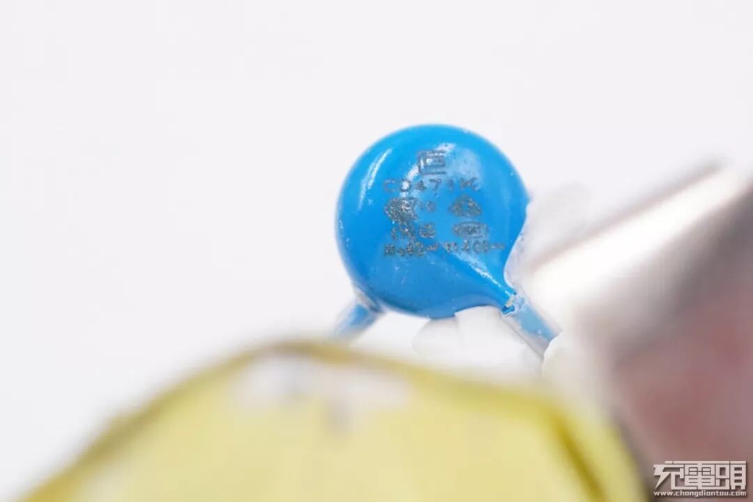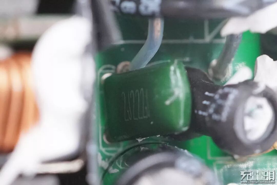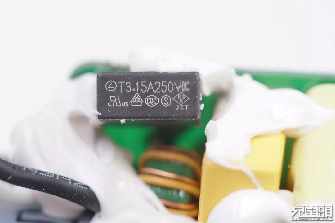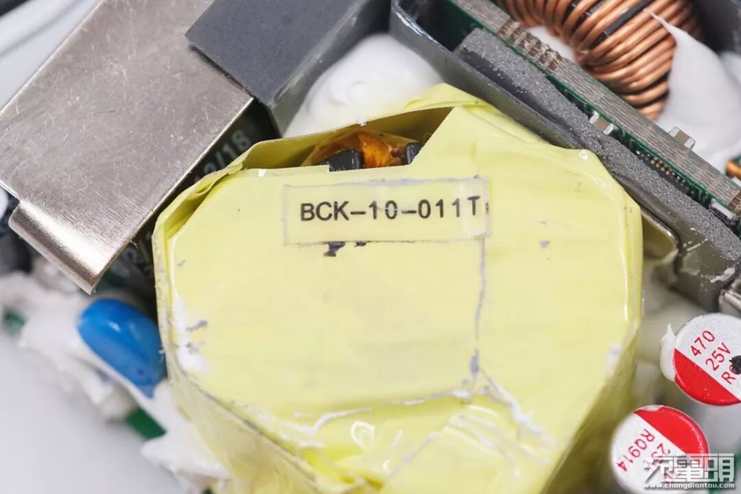 另外一侧可见初级和次级之间有塑料绝缘隔离板,一颗Y电容横跨左右,元件之间打胶固定处理。