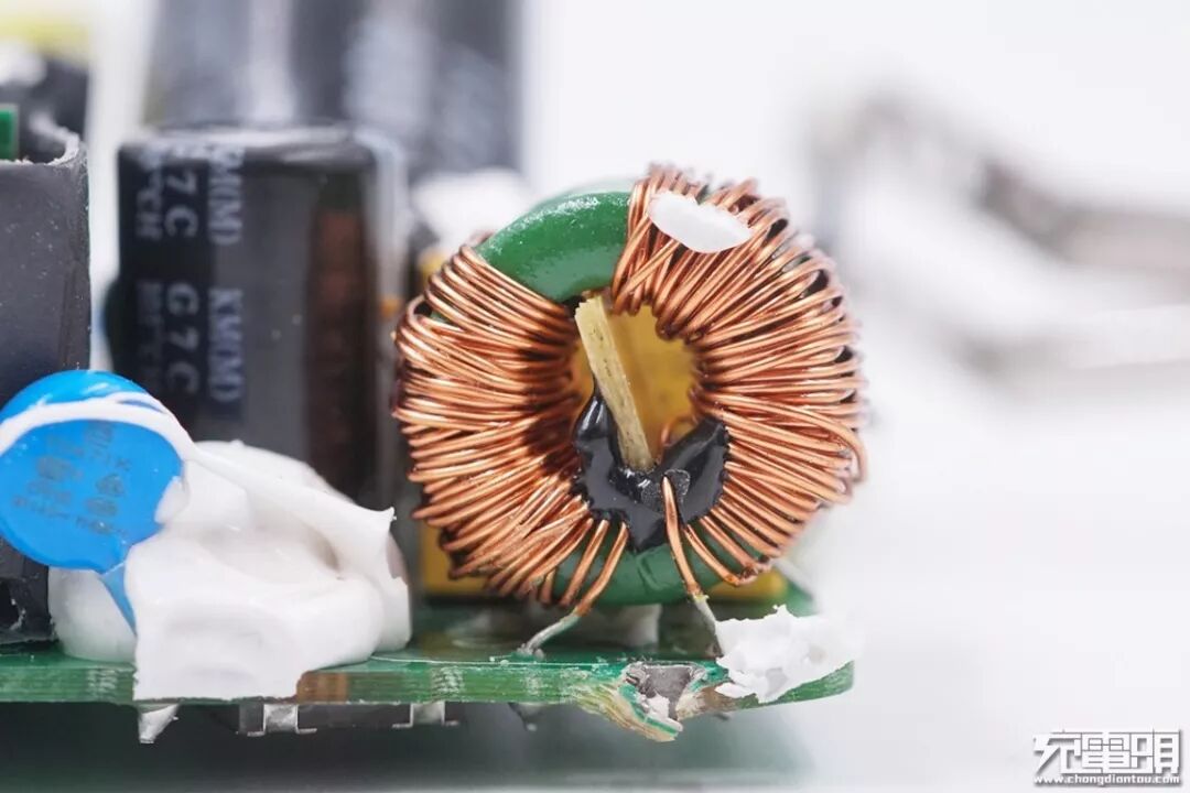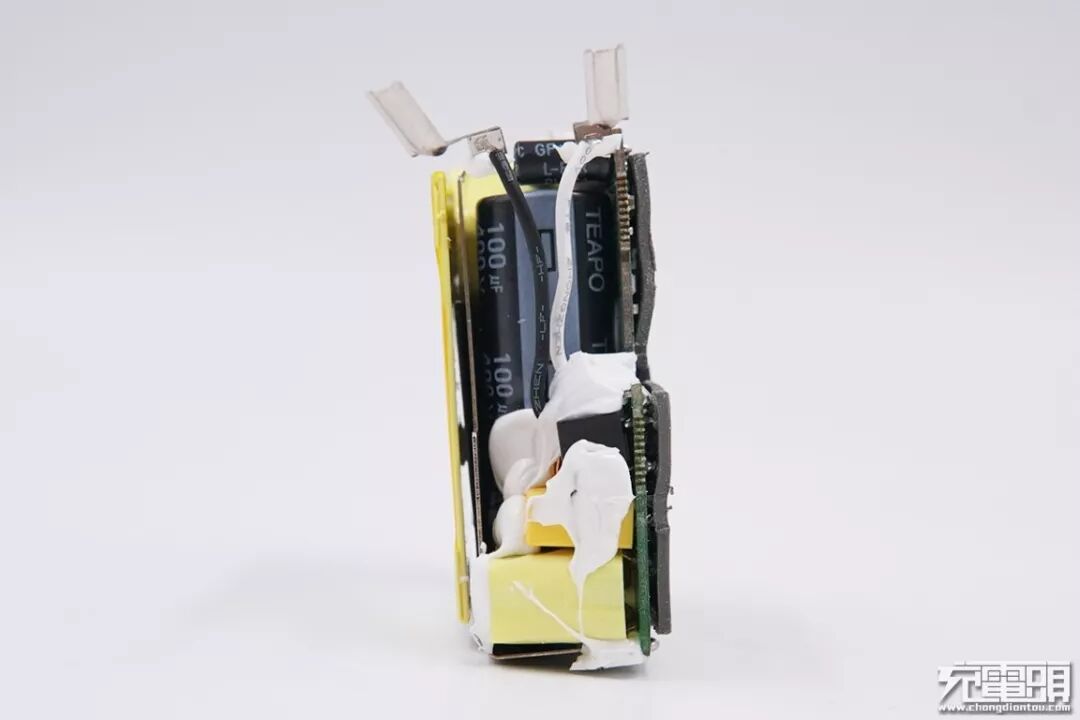 此外,充电器的内部还采用了大量了辅助散热措施,正面为金属散热片,背面为导热贴,USB-C小板上也分别使用了导热贴设计。初级和次级之间预留足够的安全距离,变压器附近采用镂空设计,增加绝缘档板;在体积较大的插件元器件之间均使用注胶的方式增加机械强度,确保整机的性能和可靠性。