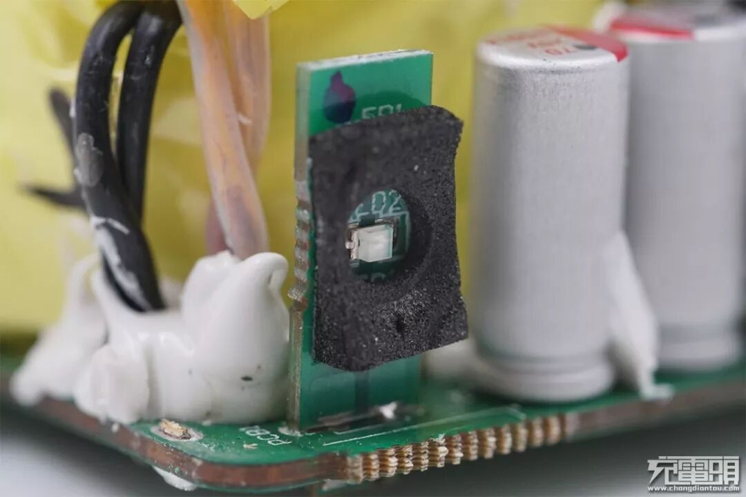拆掉PCB模块背后的导热胶,主要的控制元件一览无遗。初级和次级之间预留了足够的安全距离,变压器对应的位置镂空处理,旁边使用采用隔离档板绝缘。
