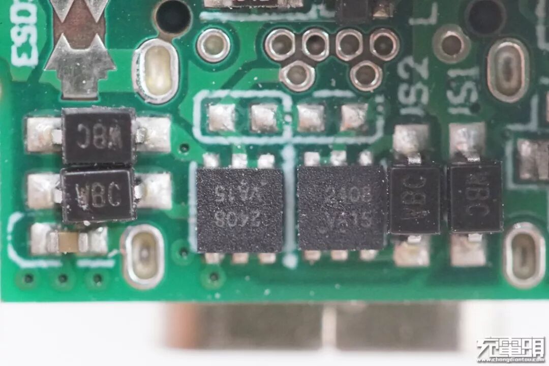靠近USB-C接口的处有四颗二极管和两颗MOS。