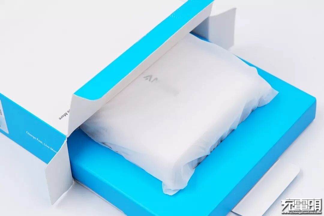 打开纸盒,内部使用蓝色纸质托盘装着充电器本体,充电器被塑料袋套着。