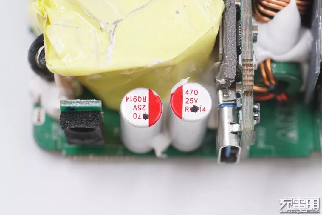 输出接口附近两颗固态滤波电容,规格均为470uF 25V,变压器右侧电路板上有导热贴。