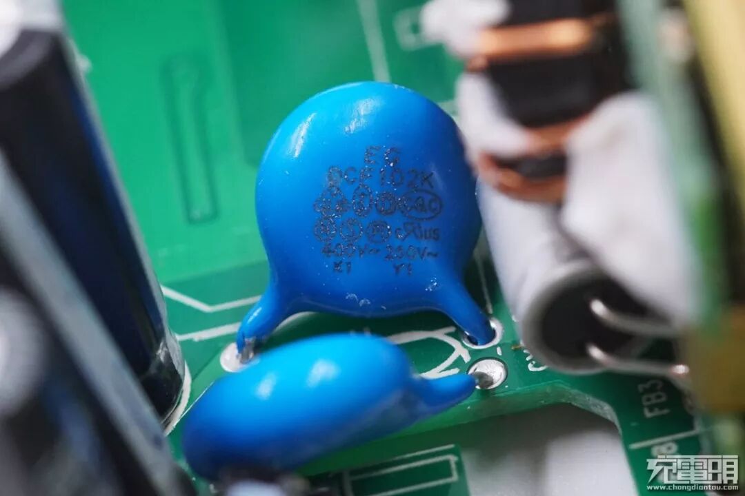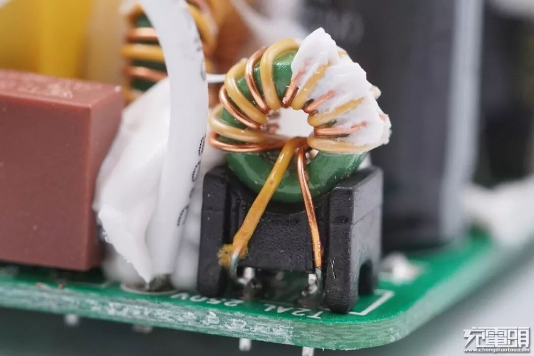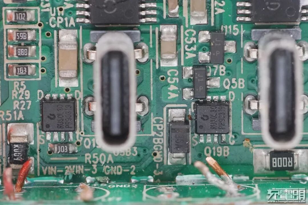里面是两个变压器,可见为两路独立输出,其中两个USB-A口为独立的一路,两个USB-C口为独立的一路。