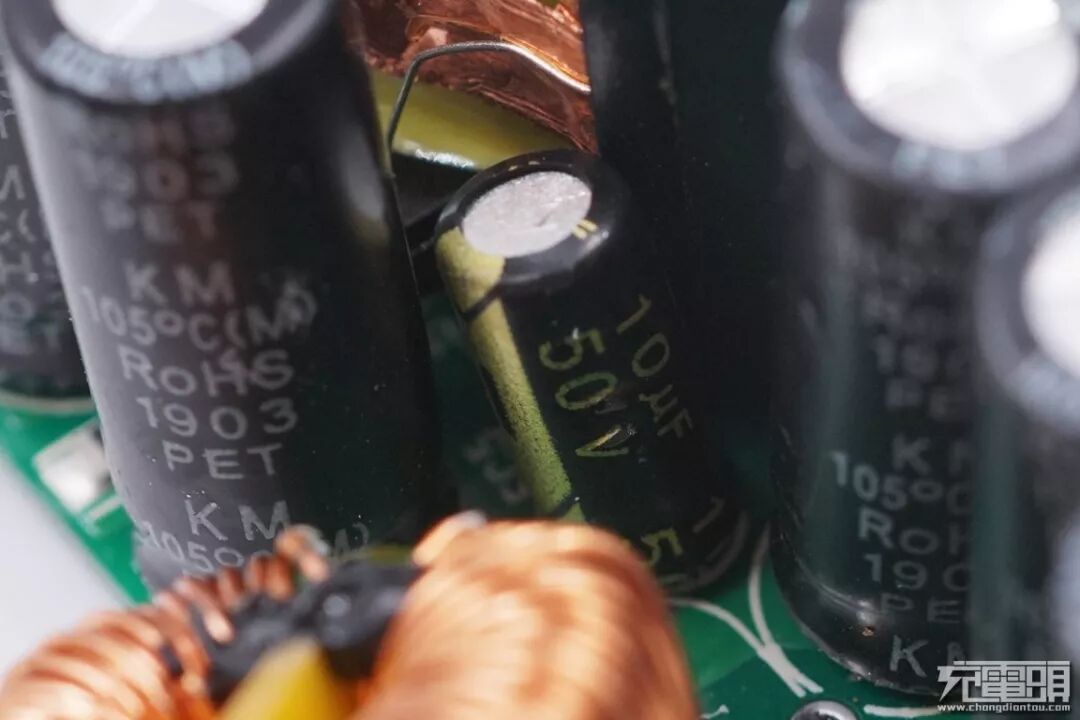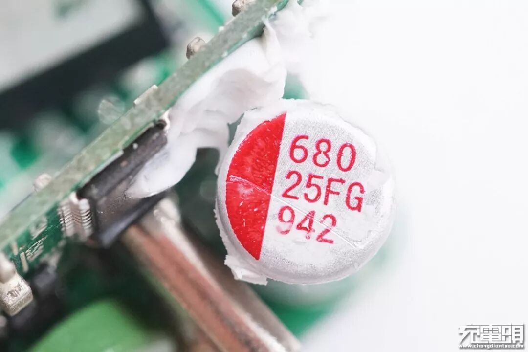 USB-A输出接口侧设有两颗滤波电容,其中一颗规格为16V 470μF。