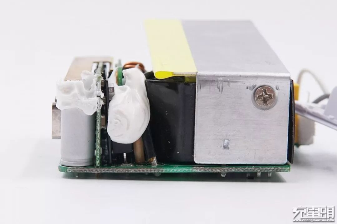 初级部分和次级部分均采用散热片设计,并有两块竖着的小板,打胶水加固和散热。其中一块PCB小板主要用于焊接输出接口、布置协议芯片;另一块PCB小板则用于二次降压,上面布置有电感线圈、降压芯片等。