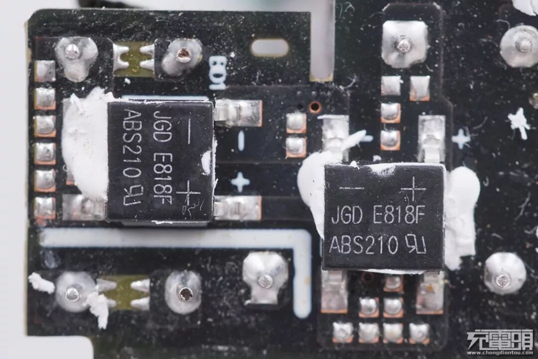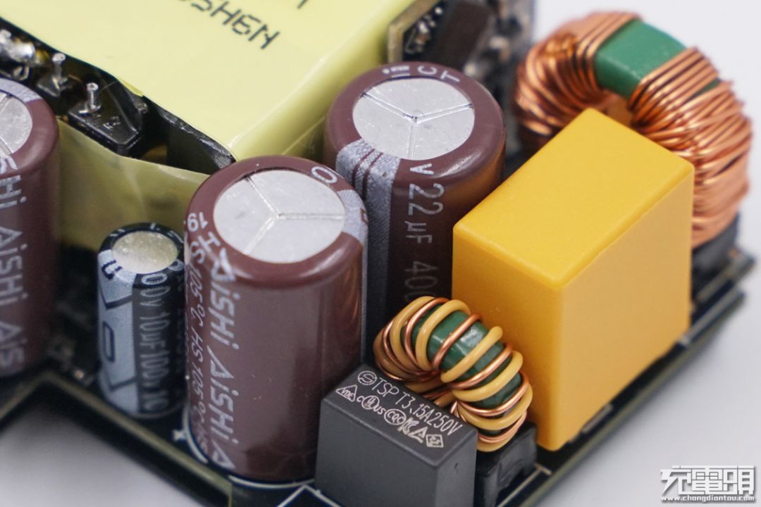用料和做工方面,这款充电器初级电路采用紫米和酷科定制的PWM主控芯片以及英飞凌CoolMOS,并在输入端采用两颗整流桥,降低温升,均分发热;次级也采用了业界主流的同步整流控制方案MPS MP6908;协议则由伟诠WT6636F实现,该芯片已经通过USB PD 3.0 PPS认证,所以产品的兼容性不会有什么大问题。Y电容采用两颗串联的方式,贴片焊接。整个充电器的内部元器件布局非常紧密,功率密度非常高。