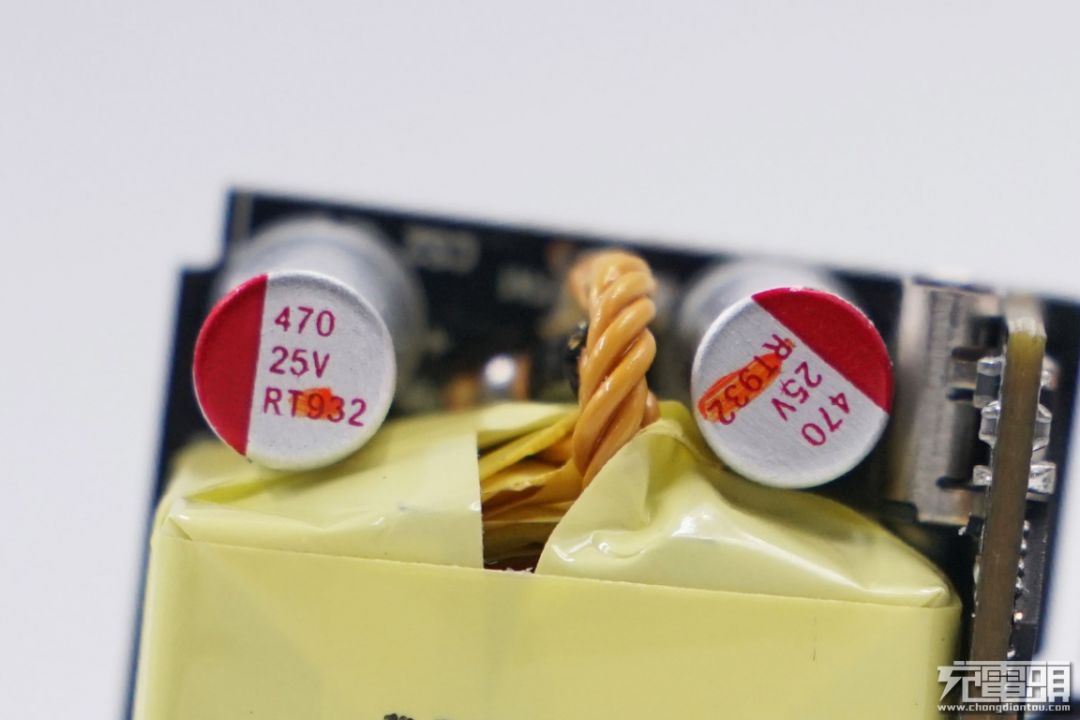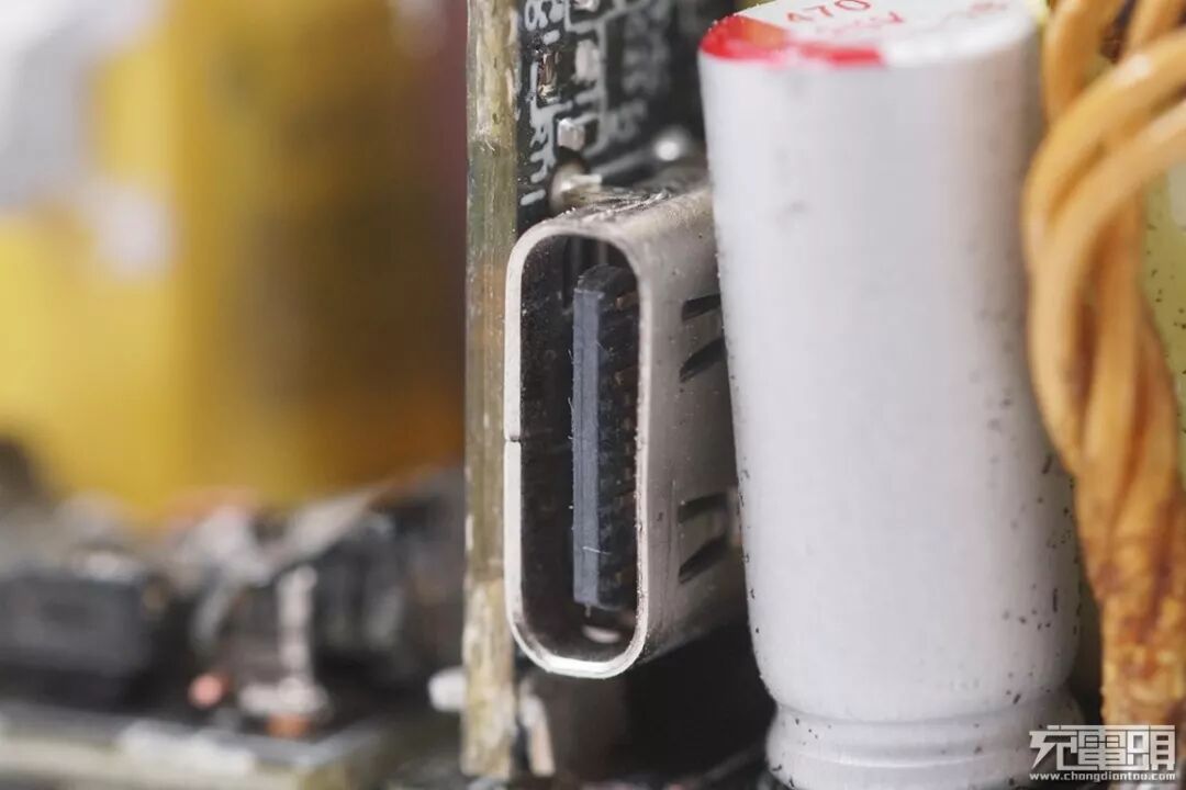 输出侧USB-C接口使用小块PCB板垂直焊接在主控PCB板上,左侧的PCB板有镂空处理,并增加了绝缘板(绝缘板与外壳一体设计);右侧是两颗用于输出滤波的固态电容。