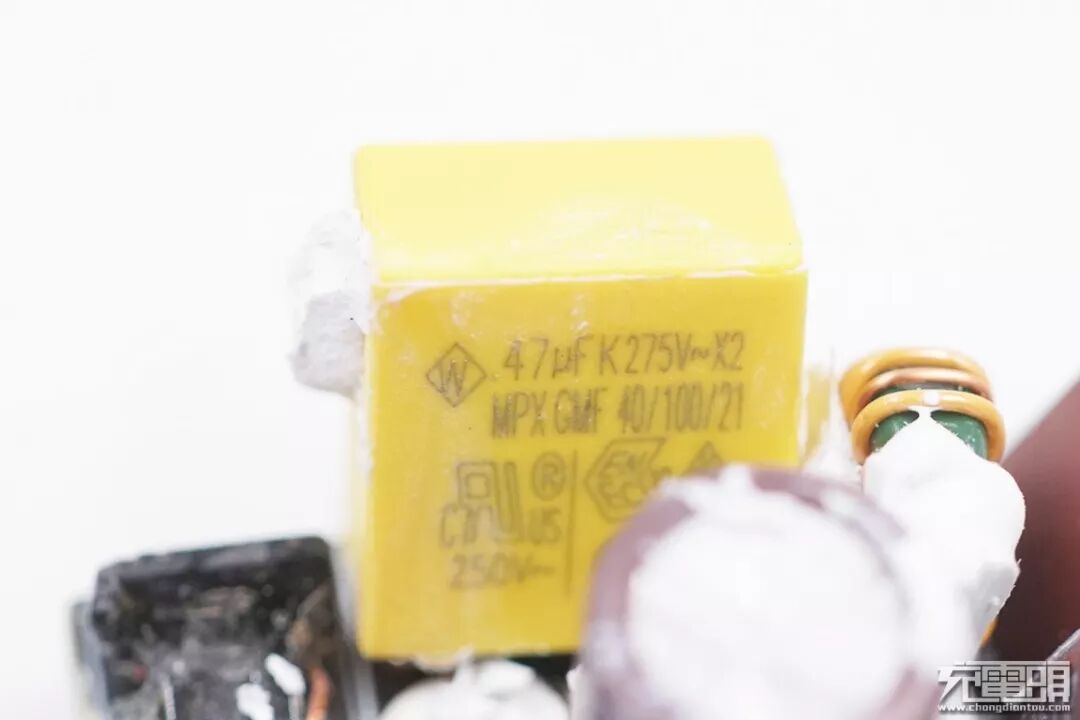 继续将充电器的外壳切开取出内部PCB板。可以看到内部PCB板的布局非常紧凑,元器件之间注满白胶。输入端设有X电容、电感、延时保险丝等元件,并采用了两大四小一共6颗电解电容滤波。