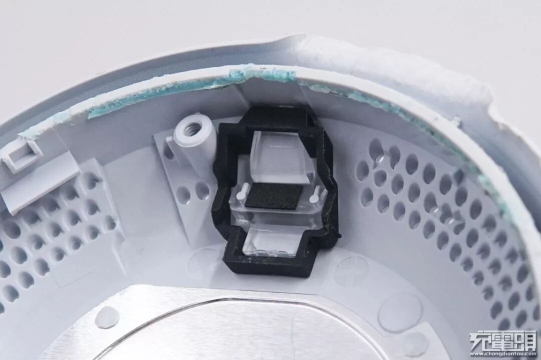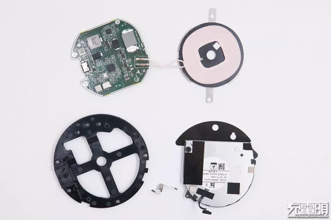 拆开胶粘的上盖,上盖内部对应硅胶防滑支撑的位置开了一圈通风口,通风口下面是无线充电线圈,通风口对应隔磁片上的开孔用来吸入空气。