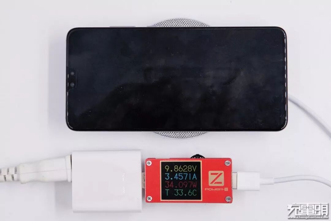 此时输入端功率34.1W左右(9.9V3.5A),经过效率换算,最终无线充电功率的确可达到华为27W超级无线快充水平。