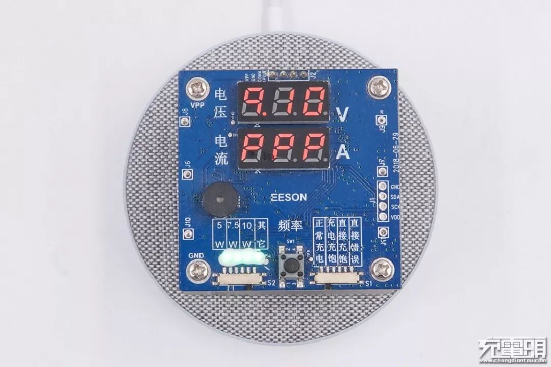 使用无线充电老化测试治具进行测试,显示“PPP”,即支持普通5W、苹果7.5W和三星10W。