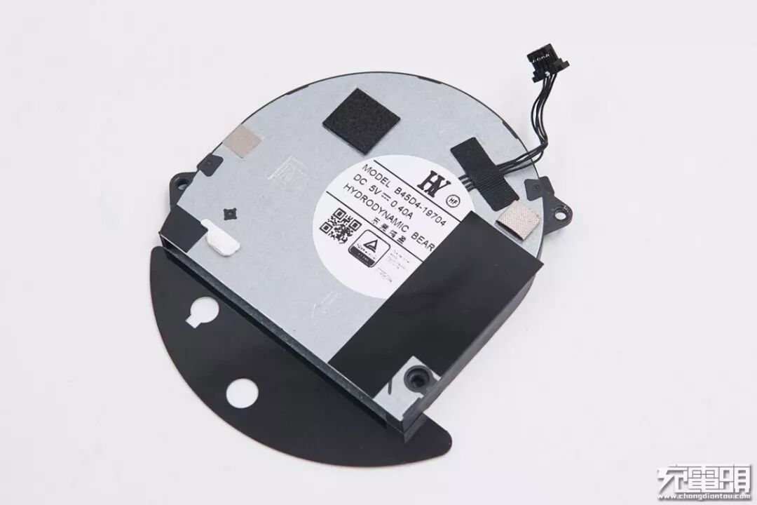 拧下螺丝移开无线充电线圈,下面是一个离心风扇,扇叶很密,通过隔磁片的开孔吸入空气,用于带走无线充电产生的热量。