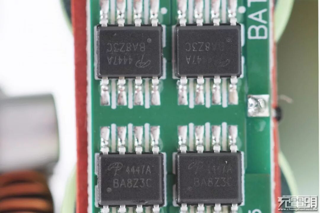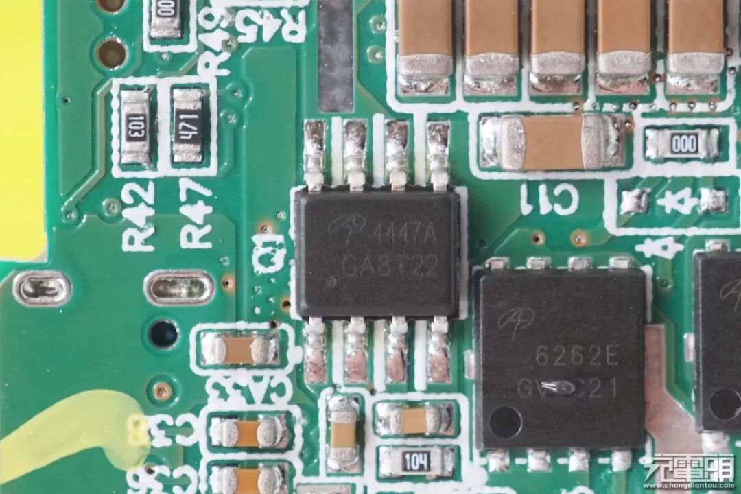 左侧为电池保护管,右侧为电池检流电阻。
