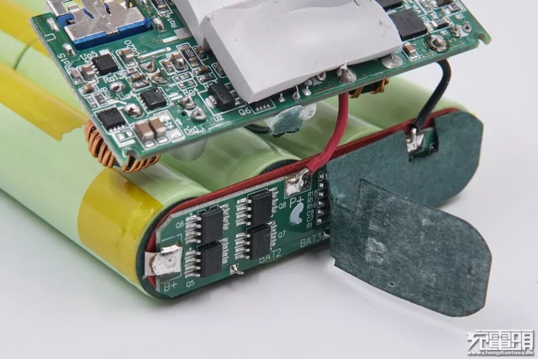 电芯外面是一块电池保护板,保护板外面有一层青稞纸保护隔离。