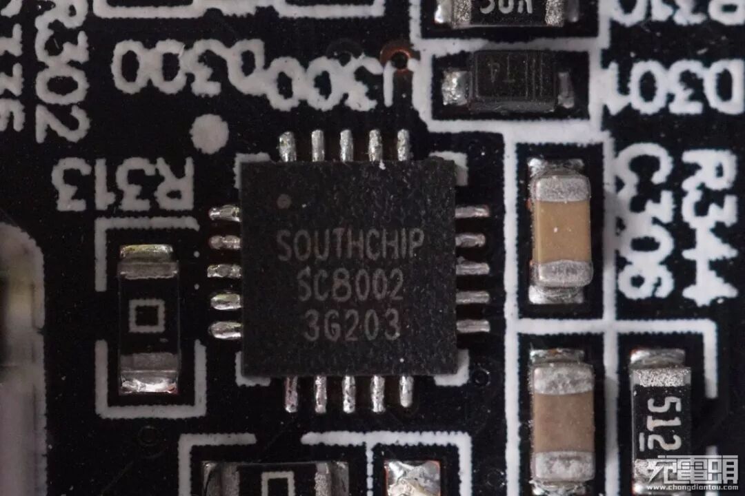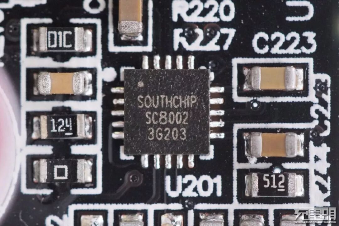 一颗同步降压控制器芯片在USB-C2接口后面,来自南芯的SC8002。南芯SC8002支持宽输入电压,可配置单或双输出,支持直通模式,可编程的峰值电流限制和输出功率限制,并且支持完整的保护功能。这里作为USB-A接口和USB-C 2接口的降压控制器。
