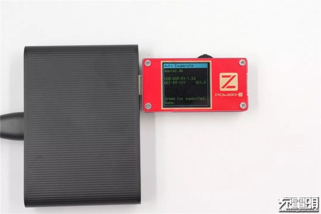 使用ChargerLAB Power-Z KT001测试仪对USB-A口进行协议检测,测得支持Apple 2.4A、DCP协议,QC 2.0、QC 3.0快充协议。
