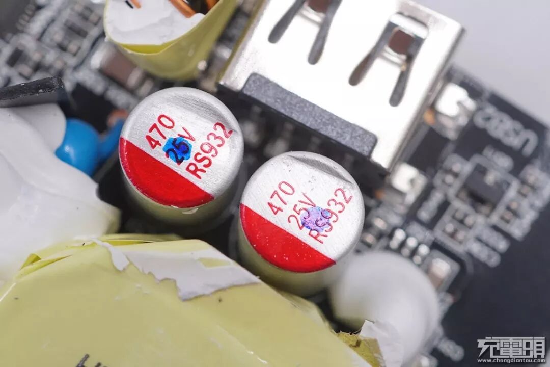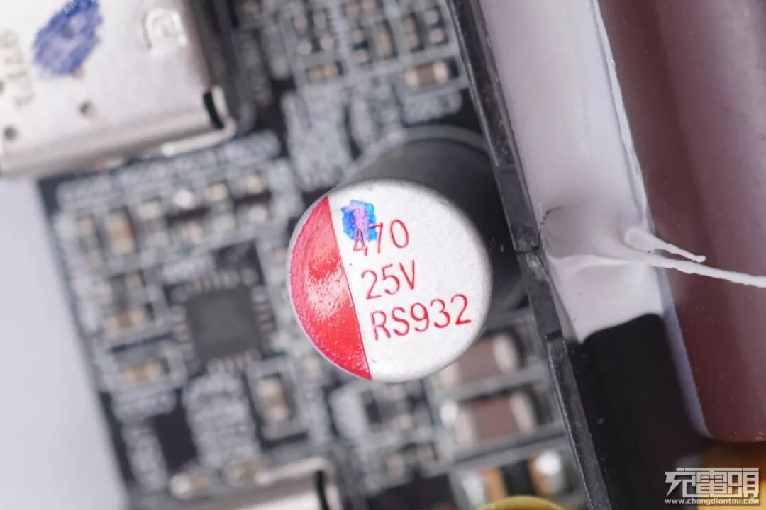 USB-C1接口输出滤波固态电容特写,在两个USB-C接口中间,规格为470μF 25V。