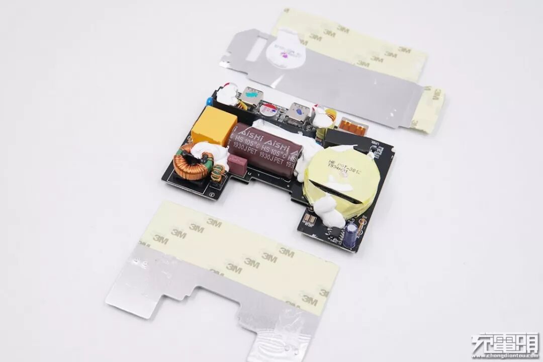“U”字型PCB板上进行大量的注胶固定和导热。居中的电解电容是Aishi艾华品牌,中间是一长一短两块黑色绝缘薄塑料档板将初级次级隔离,这个设计和笔记本电源相似,初次级一目了然。