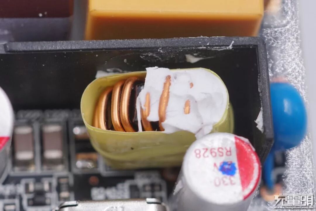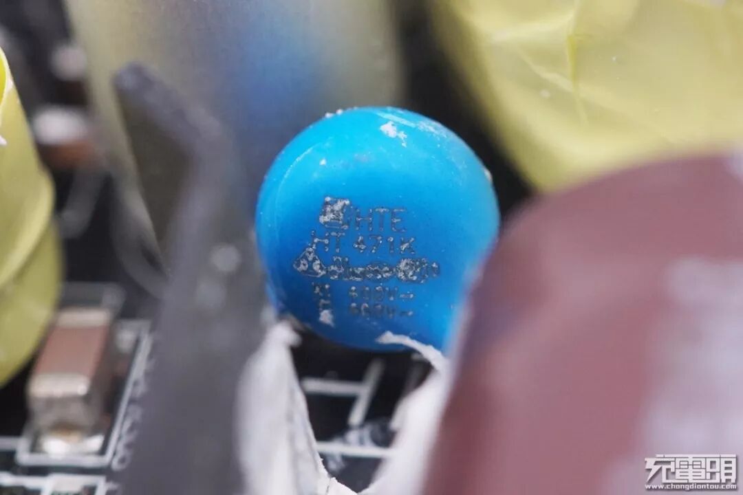 一颗蓝色Y电容焊接在变压器跟固态电容旁的,覆盖在上面的硅橡胶已经被清理掉。