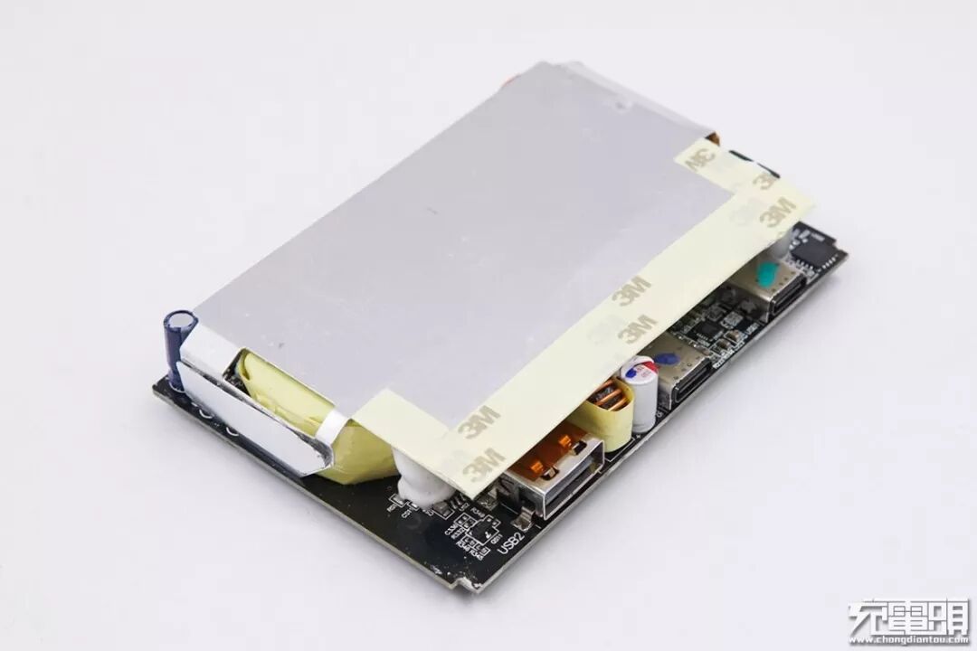 正面一块金属散热片大小与PCB板差不多,基本将所有元器件覆盖,边缘是3M绝缘胶带。