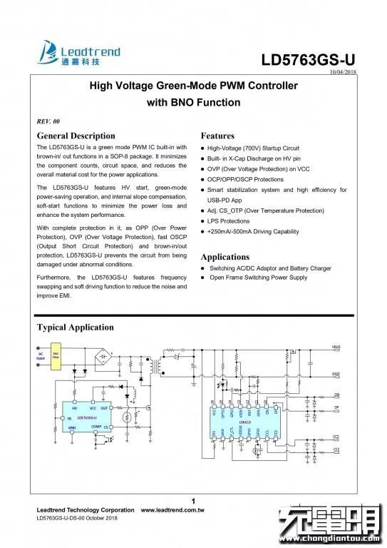 同时通嘉LD5763GS还具有完整的保护功能,如OPP(过功率保护),OVP(过压保护),快速OSCP(输出短路保护)和欠压/欠压保护,可防止电路在异常情况下损坏条件。具有频率交换和软驱动功能,可降低噪声并改善EMI,应用领域包括开关AC/DC适配器以及电池充电器开放式框架开关电源。