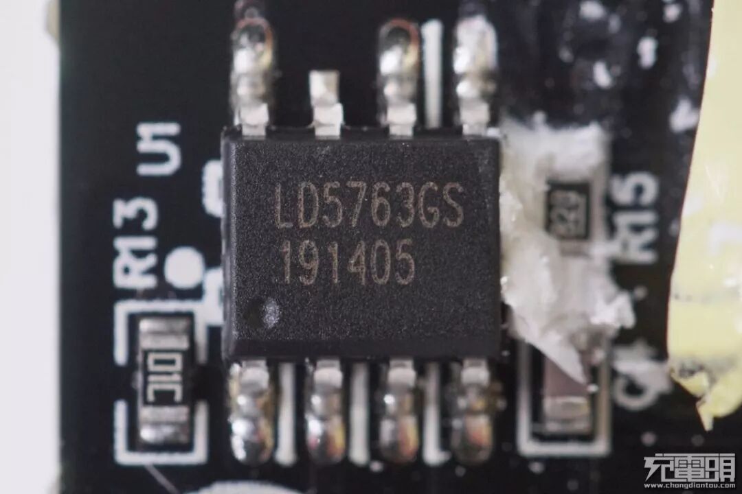 在PWM供电电容旁边就是通嘉的初级主控芯片,型号LD5763GS。通嘉LD5763GS是一款绿色模式PWM芯片。它最大限度地减少了元件数量,电路空间,并降低了电源应用的总体材料成本。具有HV启动,绿色模式省电操作和内部斜率补偿,软启动功能,可最大限度地降低功耗并提高系统性能。