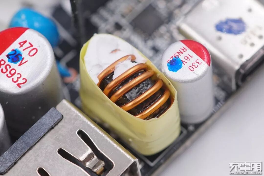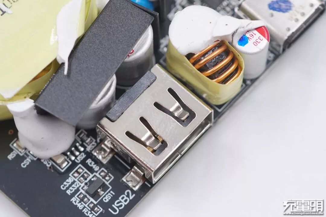 另一颗输出滤波固态电容特写,在USB-C1接口的旁边,规格为330μF 25V。与上面的固态电容协同工作一起作为USB-C1接口的输出滤波。