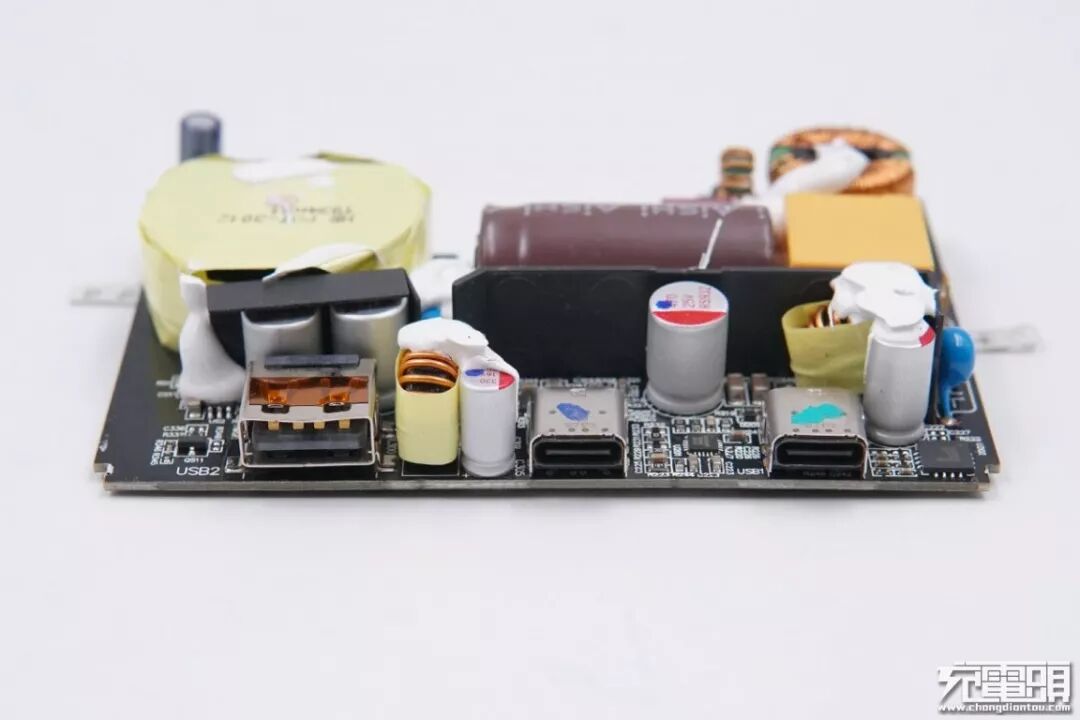 通过两个电感的分布情况以及各个接口的输出策略可以了解到,这款2C1A充电器采用的是二次降压结构。其中最右侧的USB-C接口为一路输出,另外1A1C两个接口为共用一个降压电路。