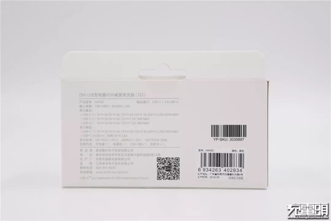 ZMI紫米USB充电器65W桌面快充版包装符合紫米一贯设计风格,纸质包装,白底黑灰字,简朴风格。纸盒上还有个挂钩,便于线下展示。包装正面左上角有“ZMI”LOGO,中央是硕大的产品实图很有辨别度,下方产品名称:ZMI USB充电器65W桌面快充版(3口),右侧还标明了三个USB口的特性:USB-C1最大65W,USB-A&USB-C2 18W快充,三口输出总共65W。