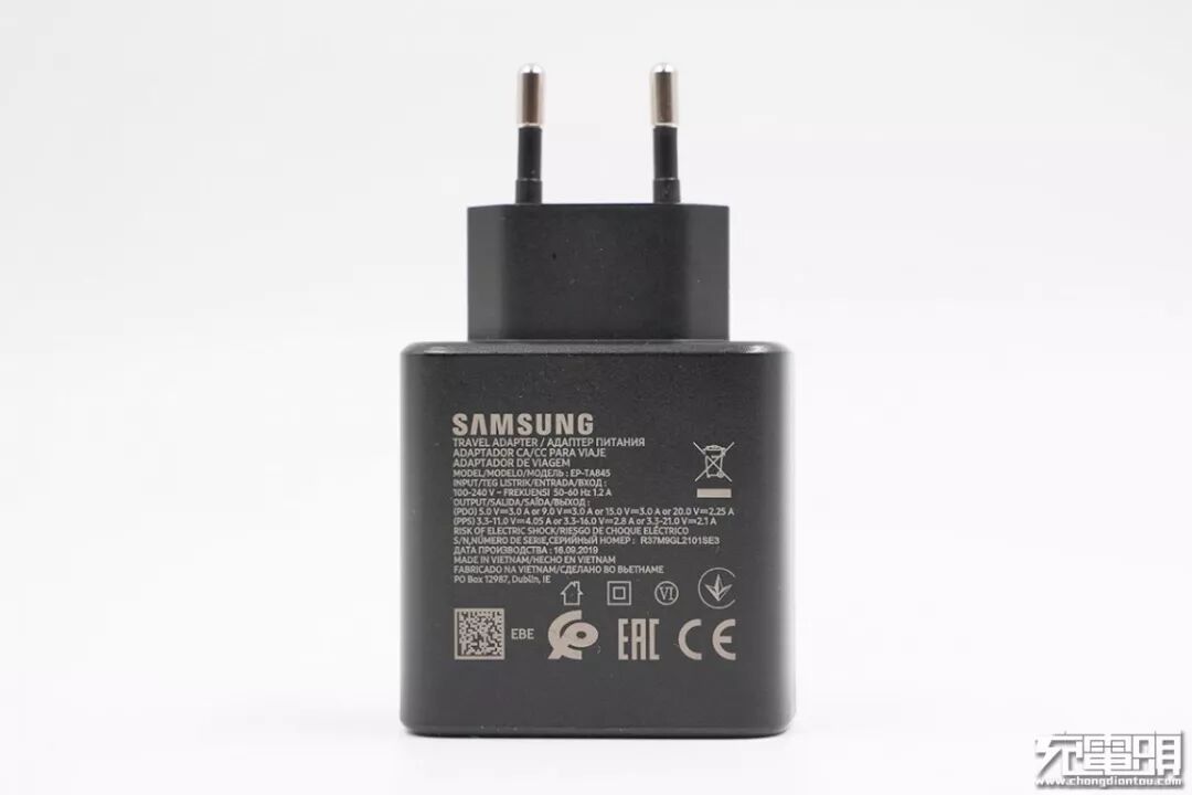 充电器背面为详细的产品信息,型号:EP-TA845;输入:100-240V~50/60HZ 1.2A;输出:5V/3A、9V/3A、15V/3A、20V2.25A;3.3-11V/4.05A或3.3-16V/2.8A或3.3-21V/2.1A三组PPS电压档位;产品为越南制造,目前已经通过了CE认证、EAC认证、摩洛哥CP认证等。