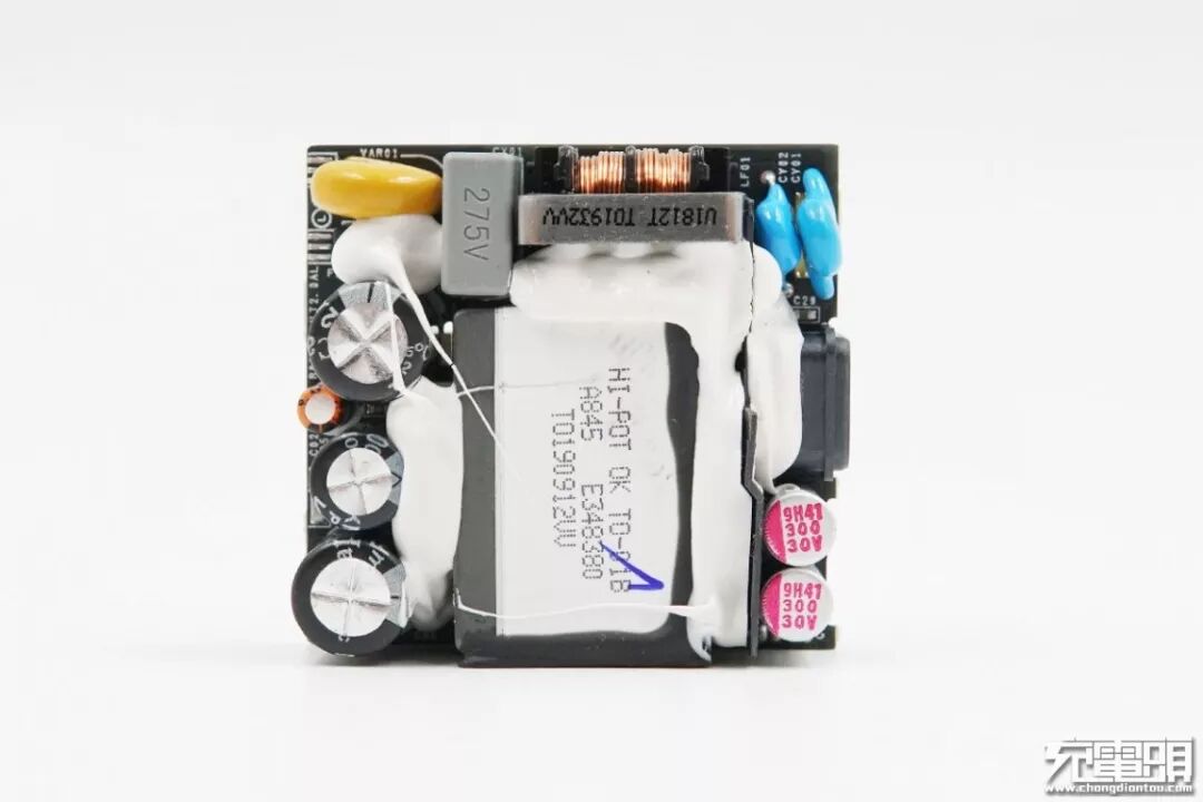 变压器左侧是输入滤波电容,上方是安规X电容和共模电感,右侧是输出USB Type-C插座和固态电容;元器件之间打胶固定,更加牢固。