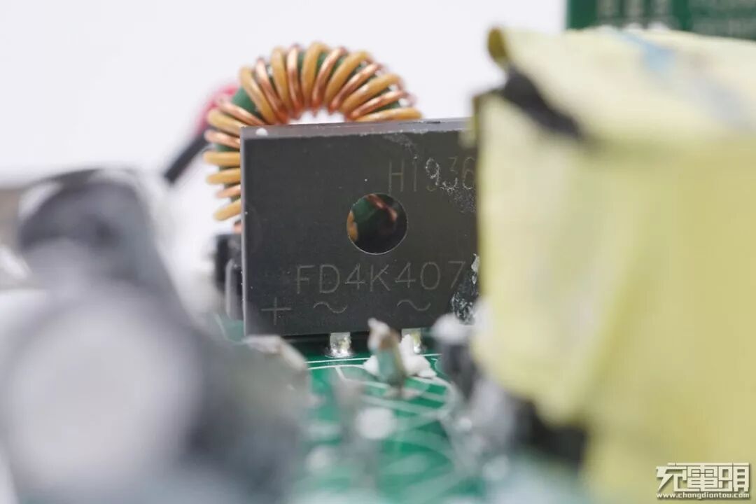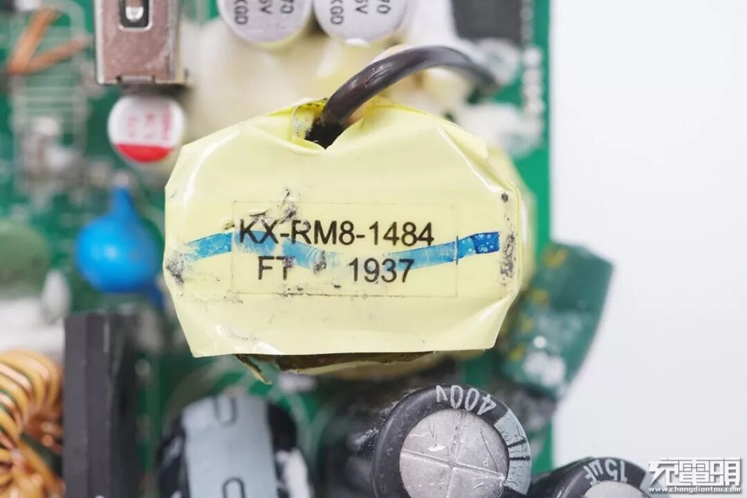 此外,产品输入滤波和输出滤波分别采用肇庆绿宝石的电解电容和上海永铭电子的固态电容。整个充电器的用料均为业内知名品牌,性能可靠;同时产品内部也采用大量的注胶处理,做工很到位,不愧为坤兴制造。