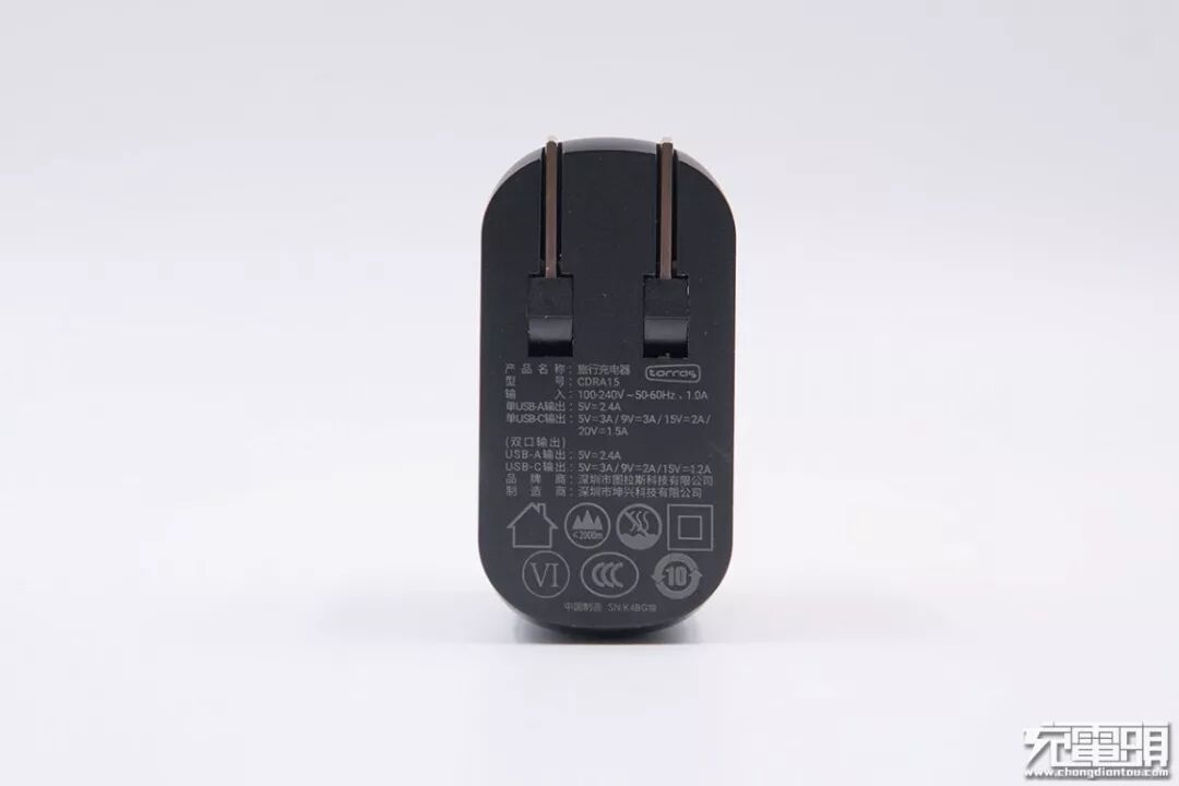 插脚侧标注了产品的详细参数。产品名称:旅行充电器;型号:CDRA15;输入:100-240V~ 50/60Hz 1A;USB-A单口输出:5V/2.4A;USB-C单口输出:5V/3A、9V/3A、15V/2A、20V/1.5A。双口同时输出时,USB-A接口依然为5V/2.4A,USB-C接口支持5V/3A、9V/2A、15V/1.2A。