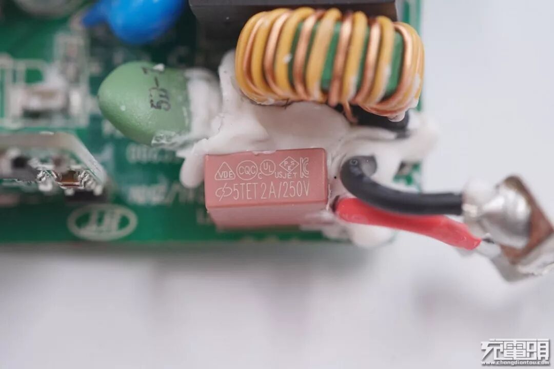 延时保险丝规格为2A 250V,与共模电感、NTC浪涌抑制电阻之间的间隙注满硅胶。