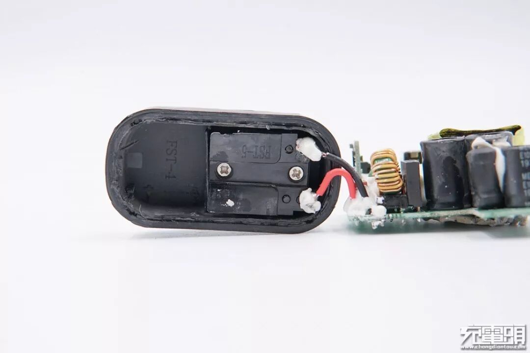 打开充电器外壳,内部PCBA模块通过两根硅胶导线连接插脚取电。插脚和PCB板两端接线处均有注胶处理。
