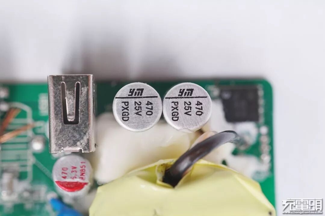 USB-C口输出滤波采用的是两颗上海永铭电子的固态电容并联,规格均为25V 470μF,尺寸6.3*12mm,属于永铭电子的NPX系列。产品具有小型化、大容量、超低ESR等特点,工作温度范围在-55℃~105℃之间,拥有2000小时寿命。此外还采用了一颗6.3V 470μF的固态电容,用于USB-A接口的输出滤波。