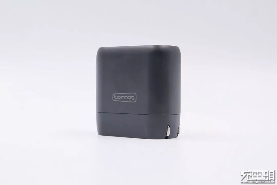 图拉斯30W 1A1C USB PD快充充电器采用黑色PC阻燃材质的外壳,周身比较圆润,手感非常好。产品表面采用哑光处理,既不沾指纹又不易被刮花;正面丝印着“torras”的品牌logo。