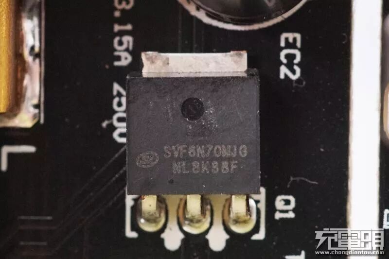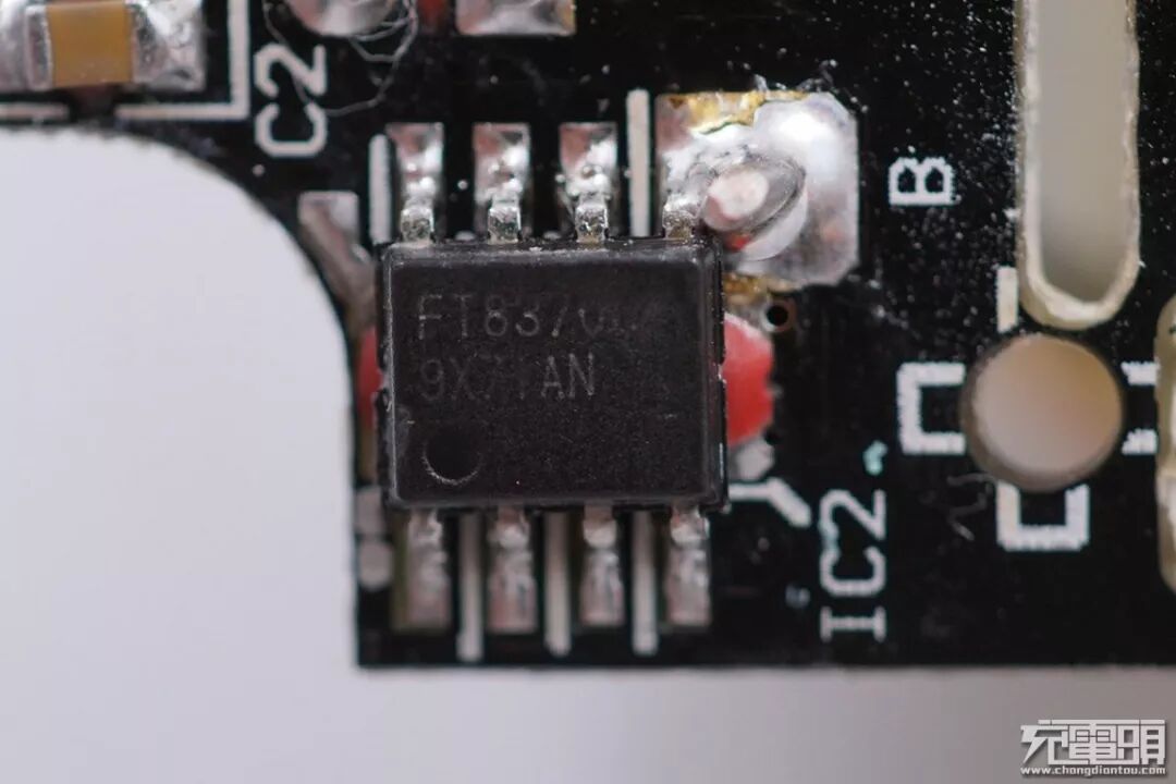 PCB板背面的镂空隔离槽在白色背景下很明显,将初次级分的很清楚。下面我们详细了解背面上焊接的芯片信息。