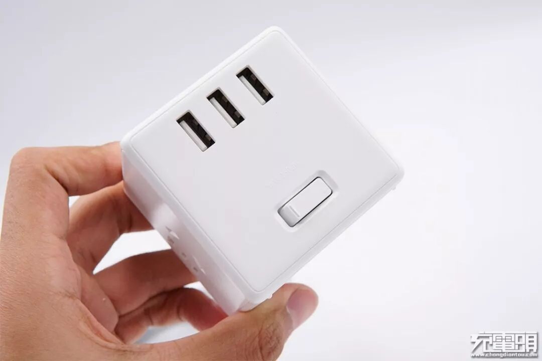 米家魔方转换器另外四个面都有输出接口,其中三个面为国标AC插孔,还有一面是USB-A接口及电源开关。
