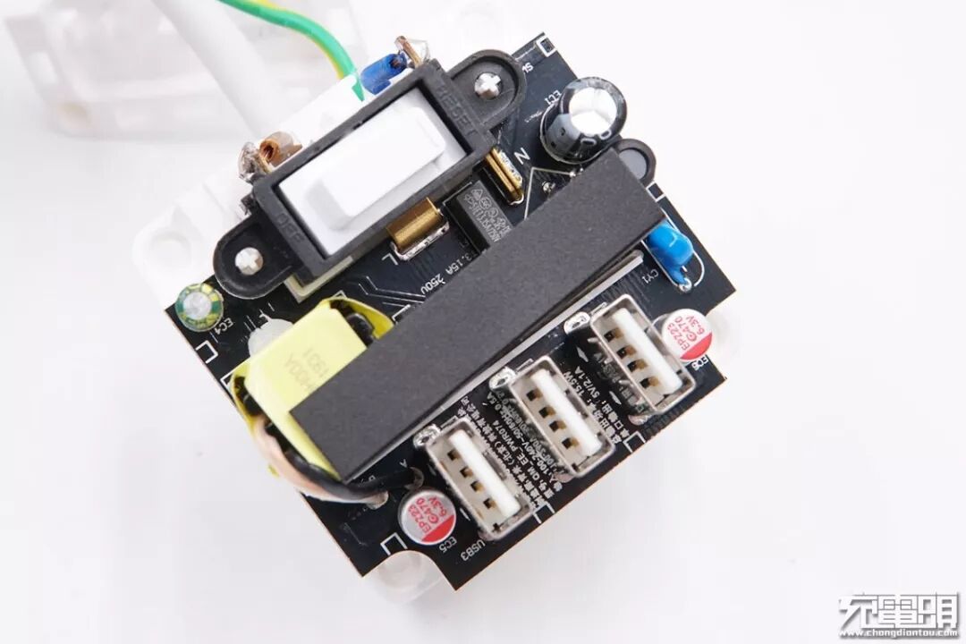 黑色PCB板上初级次级分界明显,之间使用“L”型黑色绝缘板进行隔离,开关两端使用固定柱固定在壳体上。输入端上有初级滤波电解电容、工字电感、延时保险丝、变压器、PWM主控芯片供电电容等元器件;输出端是蓝色Y电容、两颗输出滤波固态电容、3个USB-A接口。