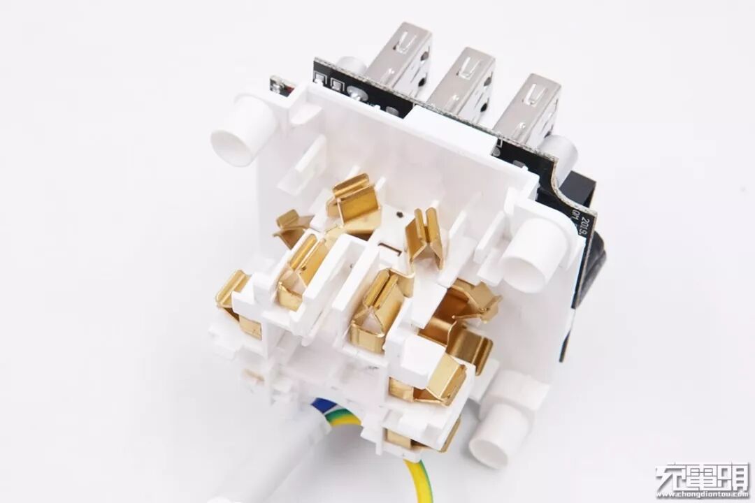 交流插孔板也是通过卡扣封装,里面使用两个弹簧来关闭安全门。
