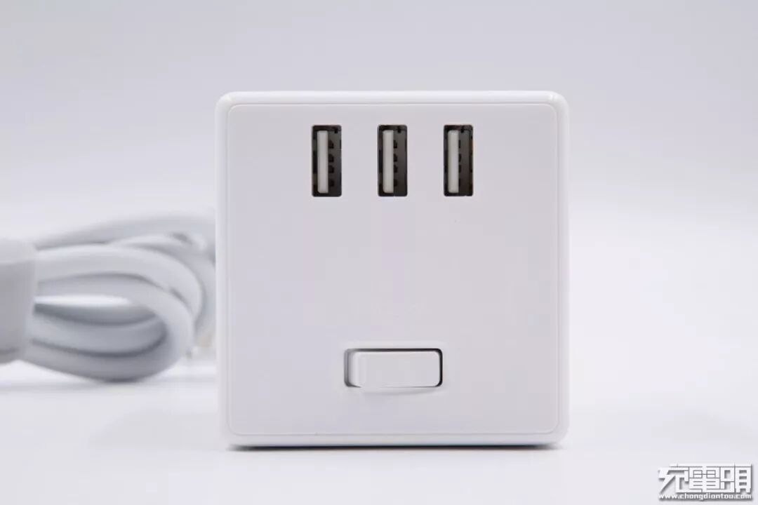 正面配备了三个USB-A输出接口,接口的下方还有一枚三合一开关,包含了电源开关、过载保护和电源指示功能。