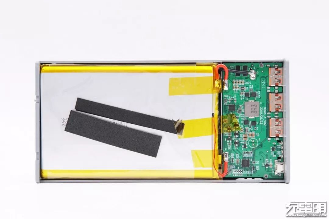 移动电源内部,电芯占据了绝大部分体积,上面还贴有两条泡棉胶进行隔离保护,防止电芯磨损。