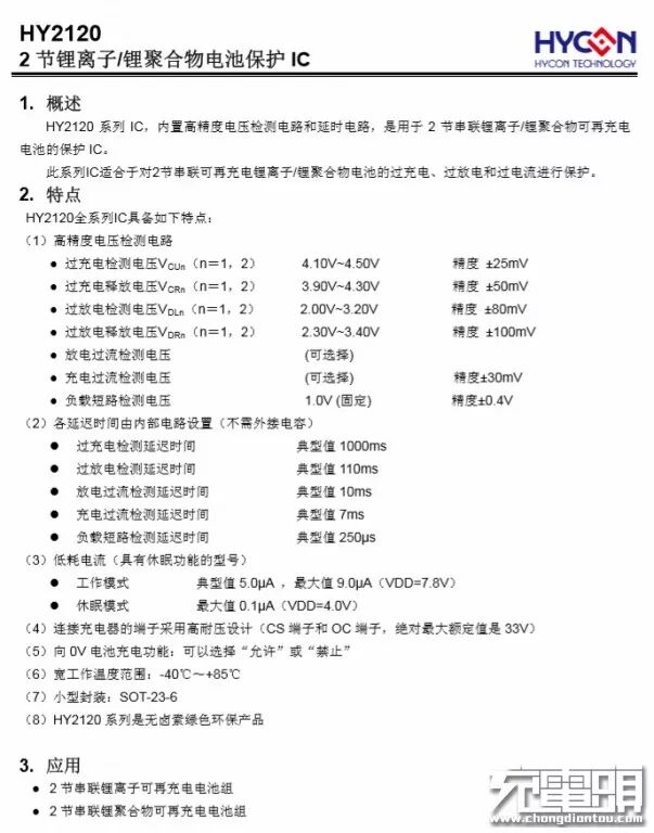 宏康 HY2120 2节锂电池保护IC,用于2串锂电池的过充,过放,过电流保护。