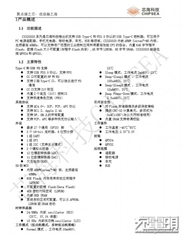 USB Type-C控制器,型号CS32G020K8U6,来自MCU芯海科技。该芯片具有四大应用特点:MCU性能强大,协议全,升级空间大;资源丰富、灵活度高;支持免拆机固件升级功能;快速开发。充电头网此前已对这款CS32G020系列芯片做过相关报道。