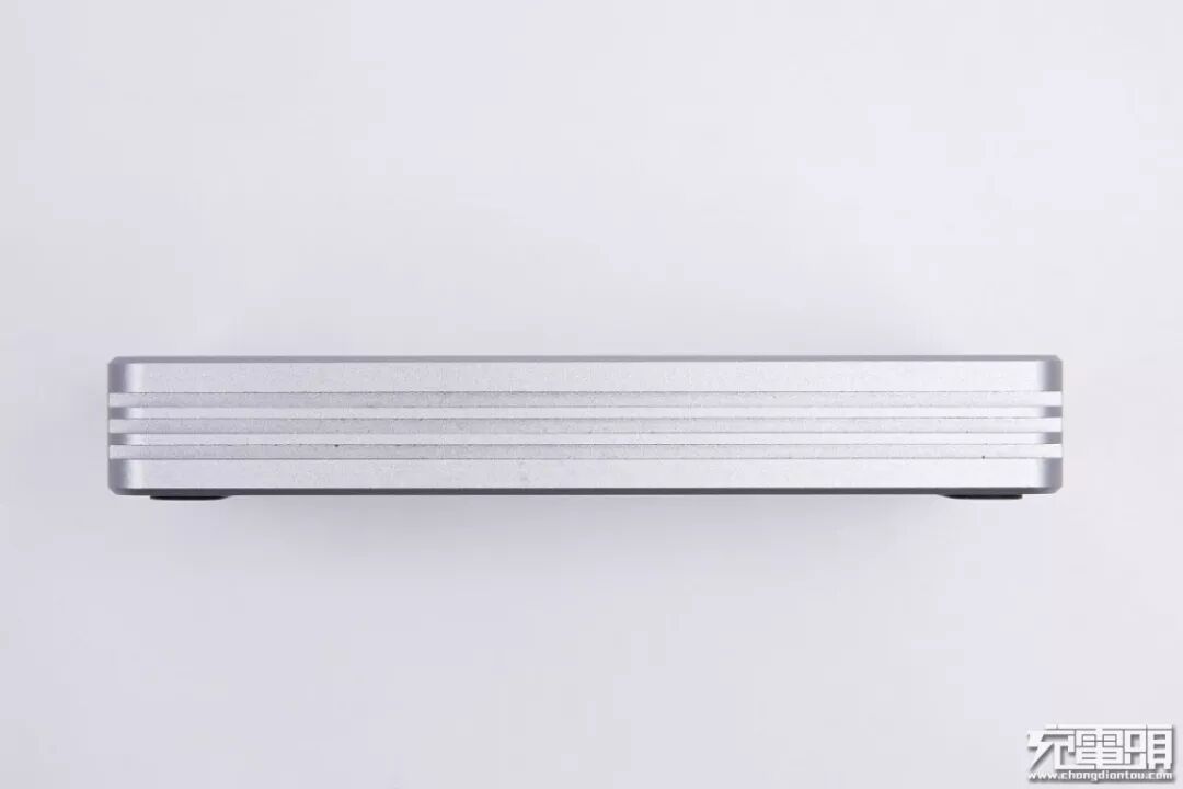 两侧是凹凸齿轮条纹,除了能给硬盘盒外观进行点缀装饰之外,握持时也能增加手感和防滑。四端为弧面过渡,边角均开有倒角,整个机身做工细致。
