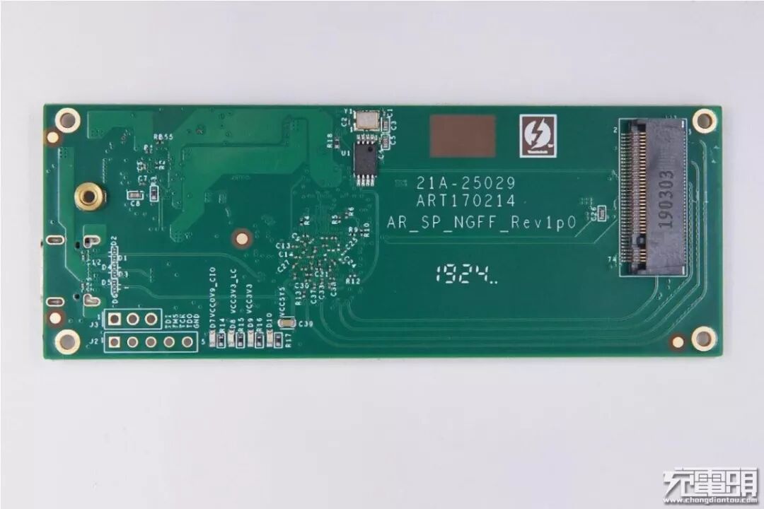 PCB板背面,右端是插固态硬盘的接口,旁边印有雷电3的标志,中间是两个元件,左下角是测试点和电源指示灯。
